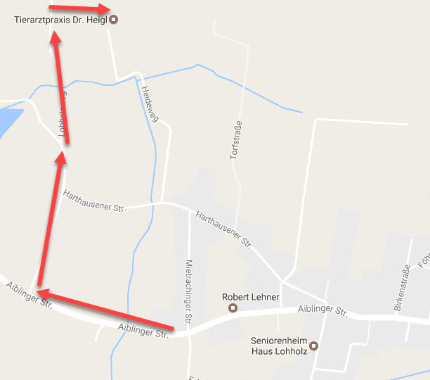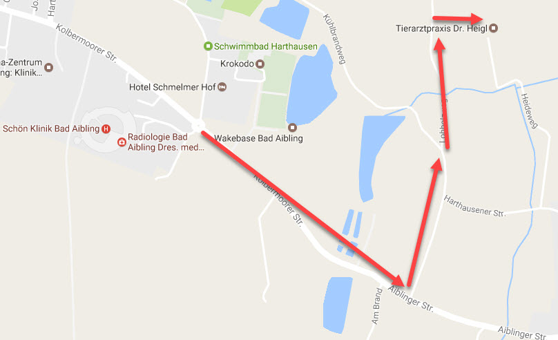 - Links nach zwei Häusern, Wiese, kleiner Wald, wieder Wiese, dann direkt nach einigen Bäumen links einbiegen; Hang hinunter auf Parkplatz der Praxis.